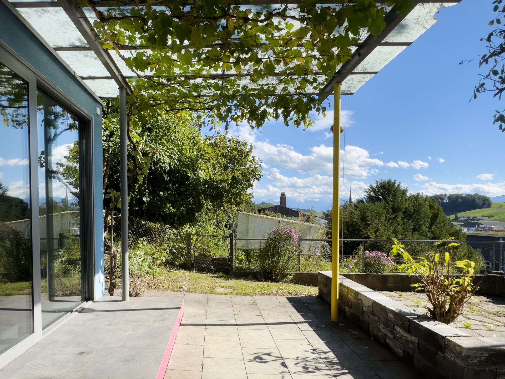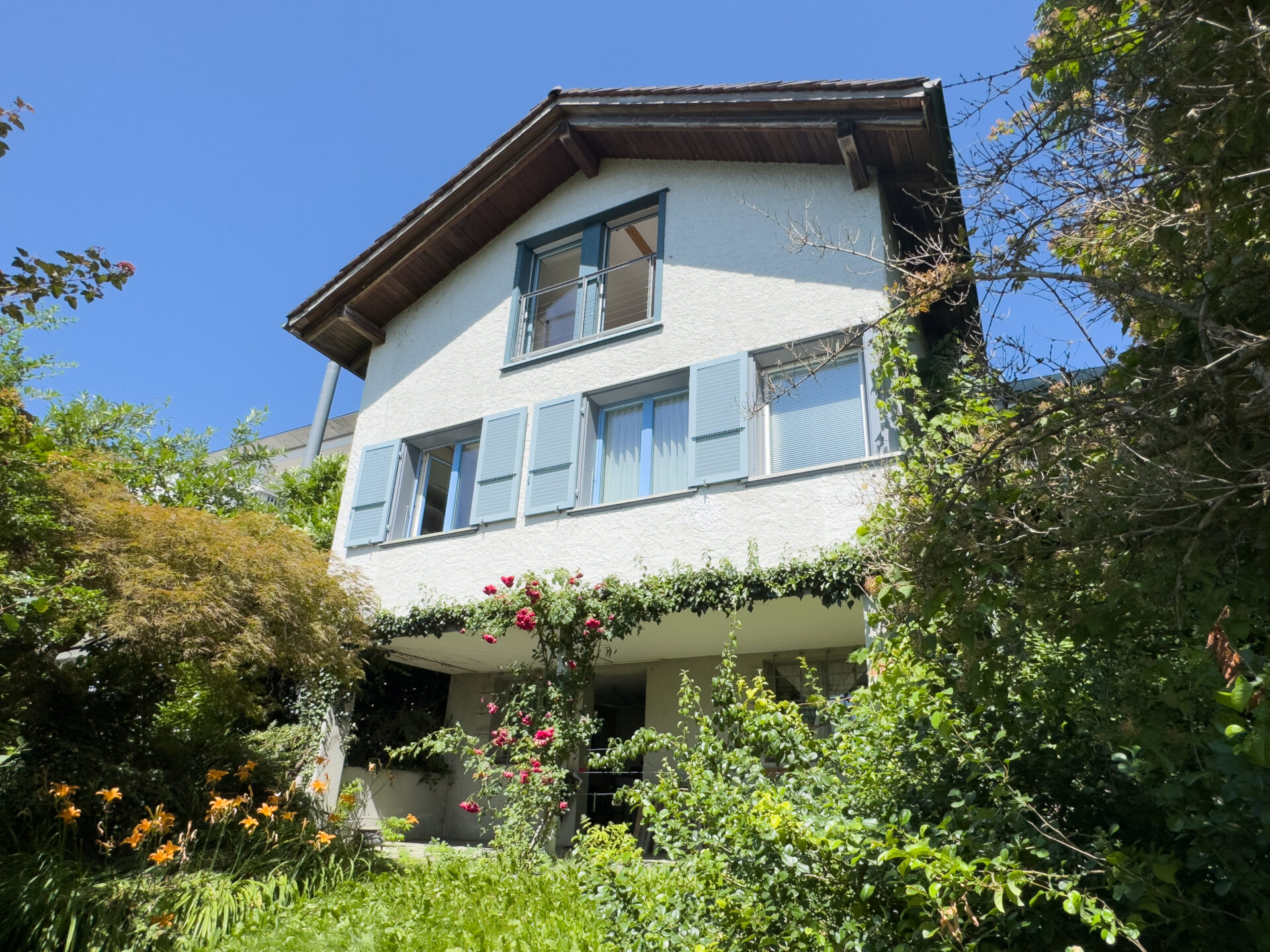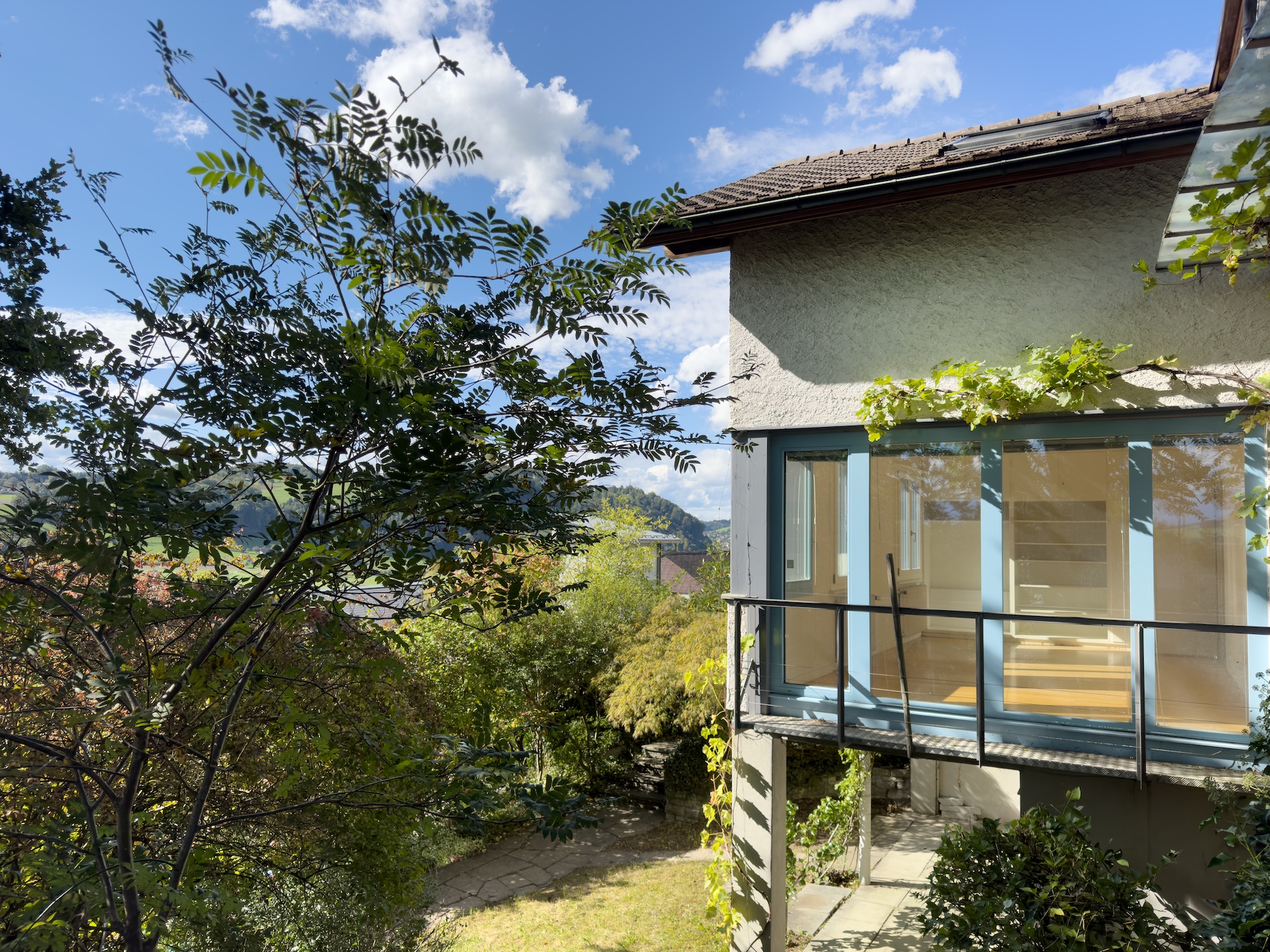 Dieses L-förmige Einfamilienhaus (Baujahr 1949) am Sonnhaldenweg 4 überzeugt mit seiner sonnigen Hanglage, grosszügigen Grundrissen und einem einladenden Anbau in Sichtbeton (BJ. 2008). Im Jahr 2010 wurde der Estrich zu einer modernen 3-Zimmer-Einliegerwohnung ausgebaut. Mit dem Lift gelangen Sie bequem auf das Grundstück. Eine clevere Anpassung, es müssen somit keine langen Treppensteige überwunden werden. Die gepflegte Liegenschaft wurde ständig unterhalten, laufend erneuert und erweitert. Lichtdurchflutete Räume schaffen eine offene Wohnatmosphäre; der Garten mit Quitten, Feigen und weiteren Obstgehölzen wird zur grünen Oase. Von Terrasse und Garten reicht der Blick bis ins Berner Oberland – mit Sicht auf die Berge, darunter Eiger, Mönch, Jungfrau, Niesen u.a.; ein Panorama, das täglich begeistert.